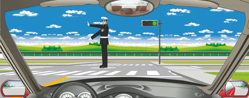 左转弯信号:交警右臂向前平伸,掌心向前;左臂与手掌平直向右前方摆动,掌心向右,准许车辆左转弯,在不妨碍被放行车辆通行的情况下可以掉头。