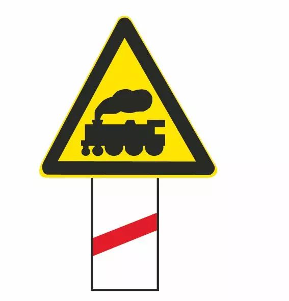 火车头是无人看守,栅栏是有人看守。红色的斜线,一条表示50米,两条表示100米,三条表示150米。图中标志表示距无人看守的铁道路口还有50米。
